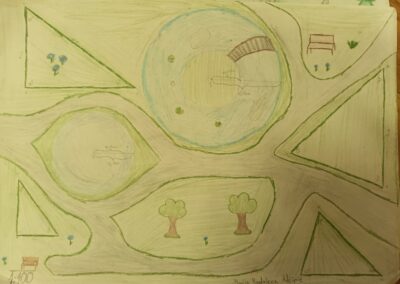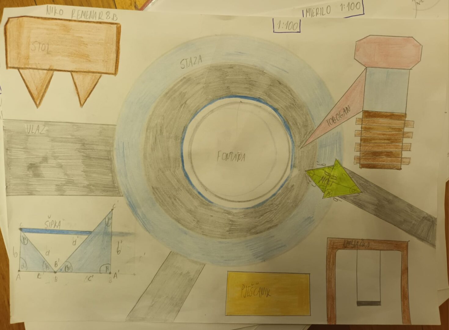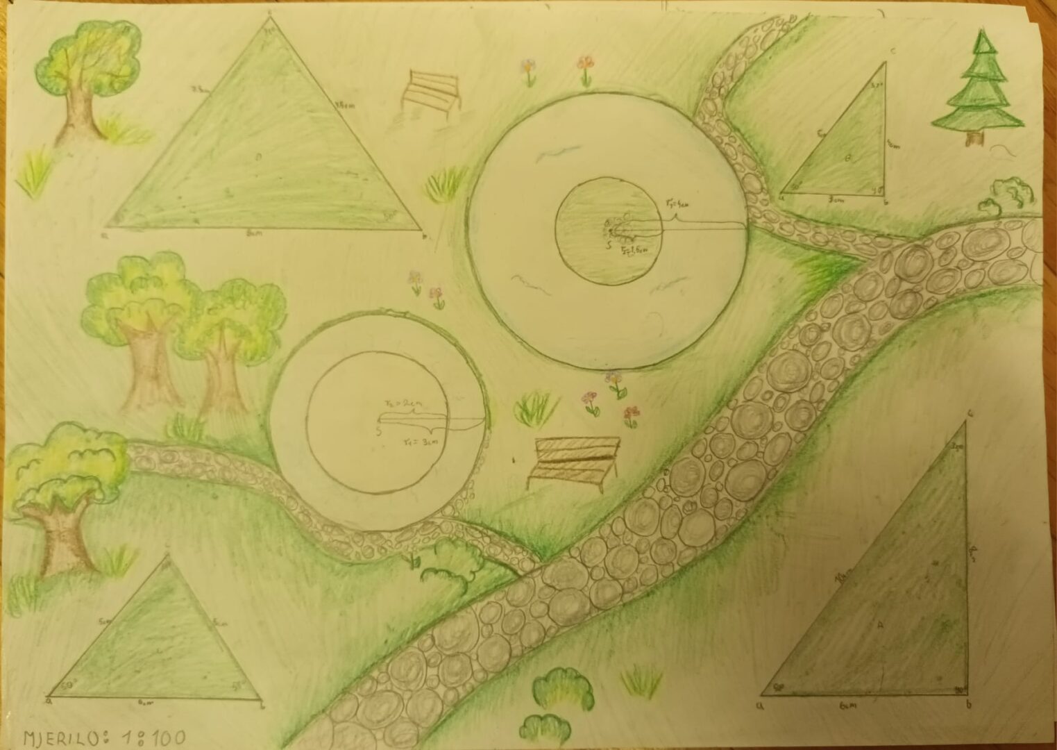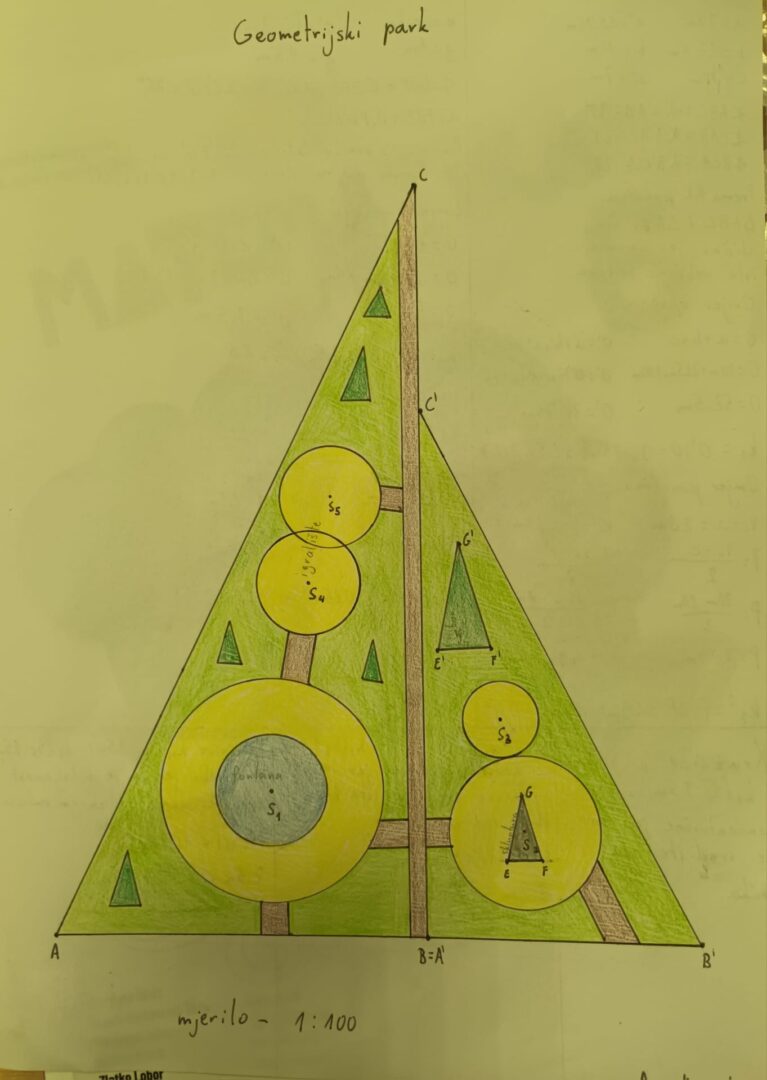 Učenici su prikazali tlocrt parka u mjerilu 1:100 koristeći barem dva para sličnih trokuta te dva primjera međusobnih položaja dviju kružnica.