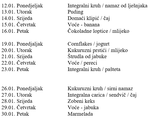 JELOVNIK ZA SIJEČANJ 2026. NAPOMENA: Škola zadržava pravo izmjene jelovnika ovisno o mogućnostima isporuke pojedine robe.