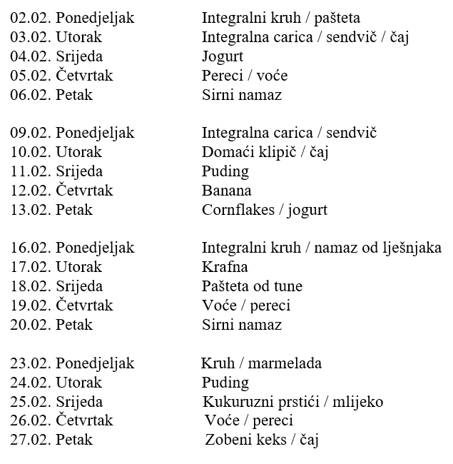NAPOMENA: Škola zadržava pravo izmjene jelovnika ovisno o mogućnostima isporuke pojedine robe.